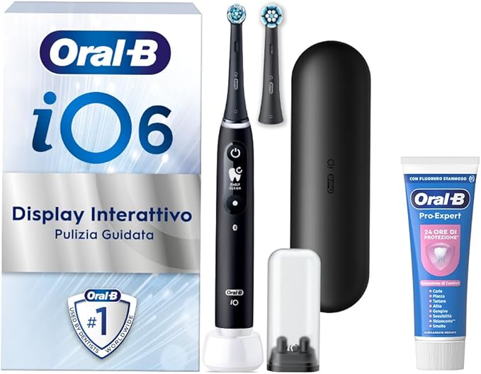 Il bundle in offerta comprende 1 spazzolino elettrico ricaricabile Oral-B iO 6N nella colorazione Nero, 2 testine di ricambio, una custodia da viaggio e in più 1 dentifricio Oral-B Pro Expert Sensibilità. Insomma, un kit completo per iniziare subito a prendersi cura del proprio sorriso con il meglio della tecnologia disponibile sul mercato.